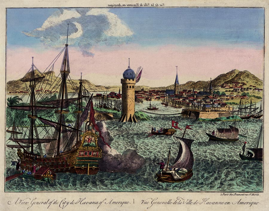 DESCRIPTION: A dramatic "vue d'optique" of Havana's great capital city. Looking shoreward from the sea, this view depicts the city with Morro Castle and many church spires. Various kinds of sea vessels fill the foreground, which is dominated by a large Spanish galleon. As is typical for vue d'optiques, the title appears in reverse above the image.
