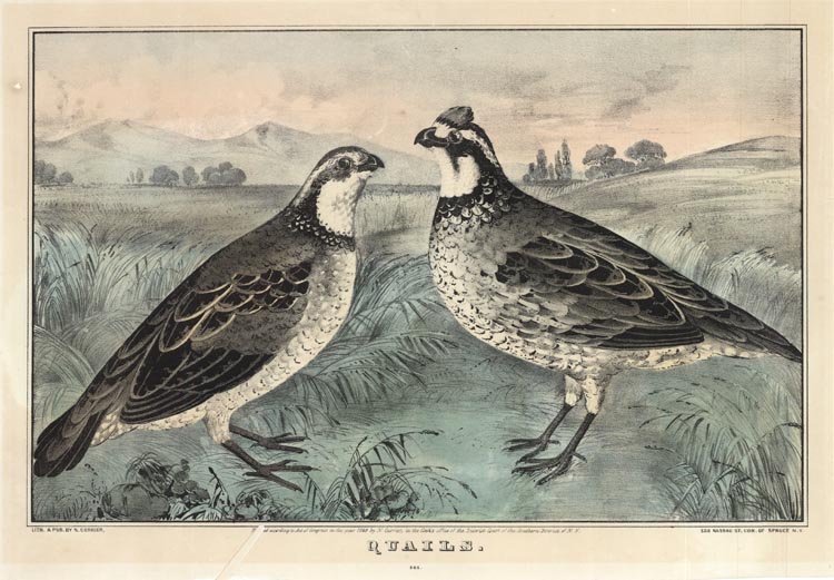 DESCRIPTION: There are two N. currier prints with this title. The orther print shows tree's on either side of the birds. This shows them in an open field.