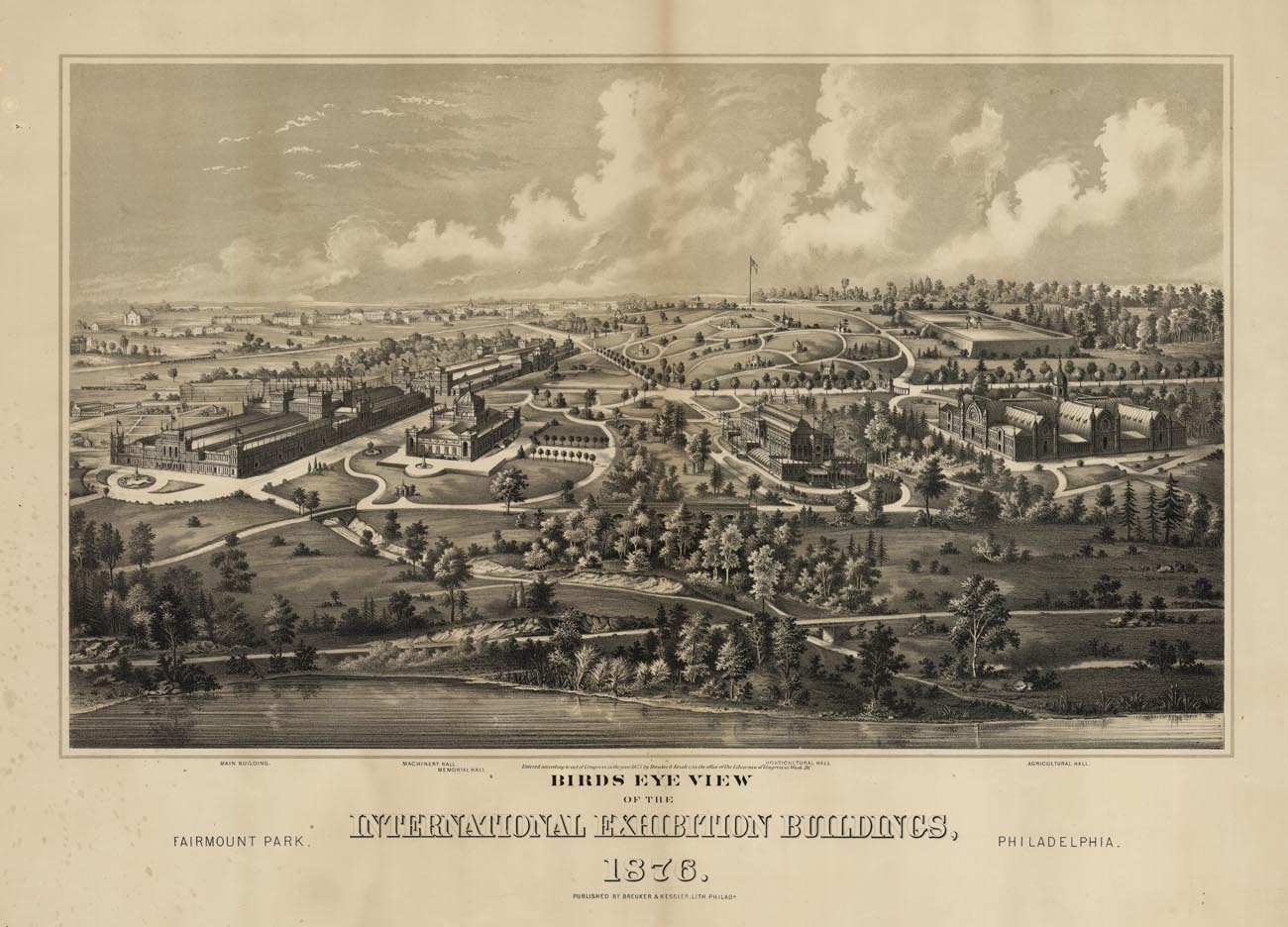 DESCRIPTION: This lithograph from 1876 offers a bird’s-eye view of the International Exhibition Buildings in Fairmount Park, Philadelphia, built for the Centennial Exposition. Held to mark the 100th anniversary of American independence, the event was the first official World’s Fair in the United States and a showcase of industry, technology, and culture from around the world. The sprawling fairgrounds were filled with grand exhibition halls, with the massive Main Exhibition Building and Machinery Hall standing out among them. Memorial Hall, one of the few surviving structures, housed an impressive art collection. Nearly 10 million people visited the fair, making it a defining moment in American history as the nation demonstrated its growing industrial and cultural influence. This print captures the scale and ambition of the exposition, preserving a glimpse of the excitement and spectacle that defined the event.