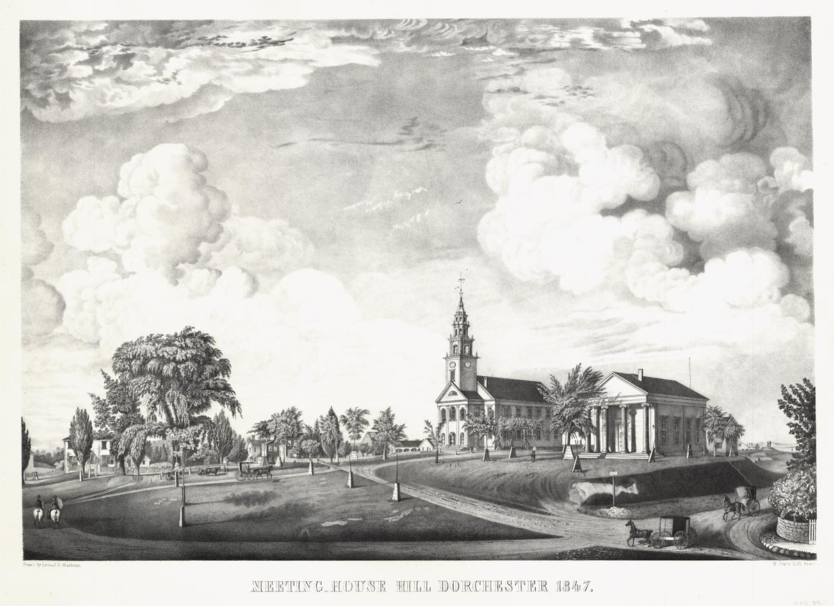 DESCRIPTION: Drawn by Lemuel S. Blackman. W. Sharp lith. Boston. <br><br> A view of Dorchester, Massachusetts. The First Parish Church can be seen just off center, on the right. It was designed by Oliver Warren and was erected in 1816, only to burn to the ground in 1896. The church was rebuilt the following year. Beside it, just to the right, is Lyceum Hall. <br><br> The First Parish Church of Dorchester was established in 1631 by Puritan colonists. It was a multifaceted building, hosting town hall meetings, the first tax-supported elementary school in the new world and, of course, religious worship. Pictured is the fifth reincarnation of the building. <br><br> Lyceum Hall was another important structure in Dorchester's history. Erected in 1838 and opened in 1840, it served as a community center where lectures, demonstrations, dance classes and other public gatherings took place. It became a temporary place of worship for Irish Catholic immigrants during the 1870s while Saint Peter's Church was being reconstructed. Father Peter Ronan held their first meeting there in 1872. Lyceum Hall was demolished in 1955.