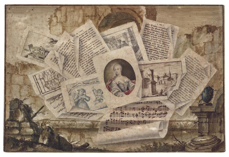 DESCRIPTION: Trompe l'oeil watercolors showing 'works on paper' within an architectural ruin. Top image showing Central figure of a woman dressed in white. The sheet music, under the central figure, cleverly follows the structural horizon line tying everything together. The copying skill by this unidentified artist can be seen in his/her interest and ability to capture the quality of stipple engraving and different types of printed text, as well as recreating the lines of an engraved landscape with a brush. Some other details include a map of France showing a bit of the Mediterranean Sea and a page with Arabic writing. Beautifully composed - this piece seems to flatten time by the artist’s specific selections and repetition of motifs. LOWER IMAGE with central figure in a blue dress. The central portrait of a young girl wearing a pink bow is surrounded by unfolding paper sheets. Each graphic sheet depicts a different scene - a mythological story, architectural detail, a landscape, and genre scene, as well as beautifully recreated text sheets in German, Greek, Italian and French languages. Whether this assortment of ephemera is selectively compiled with intended meaning or loosely assembled is not clear, although we lean toward the former based on the artist’s articulate ability for detail. The lower right figure is taken from an engraving after the painting 'Jeune fille qui fait voler un oiseau' (1717) by Jean Raoux. Viewing the pair together another layer of questions arises. Is this a mother and daughter portrait or possibly one individual in youth and in later years? Artwork, on both sheets, is painted to the paper edge - finished with two ruled lines. On laid watermarked paper with old paper backing.