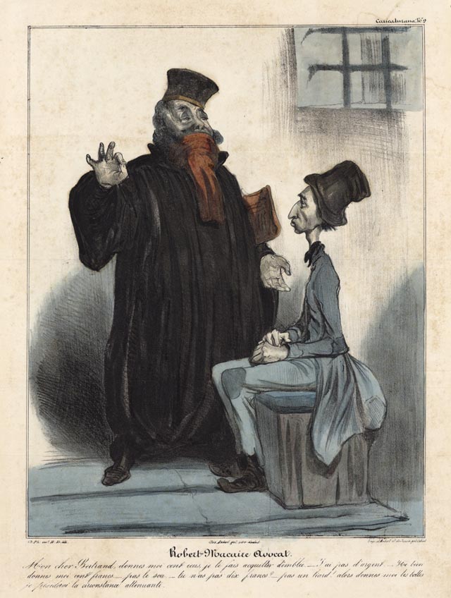 DESCRIPTION: Ch.Ph. invt. H. D. lith. Imp. Chez Aubert, gal.vero dodat. D’Aubert et de Jumer gal. Colbert. Mon cher Bertrand, donnes moi cent ecus, je te fais acquitter d’emblée. – J’ai pas d’argent. – He bien donnes moi 100F - pas le sou - tu n'as pas dix francs?.... pas un liard! alors donnes moi tes bottes je plaiderai la circonstance attenuante. <br><br> Translation: My dear Bertrand, give me a hundred crowns and I'll get you acquitted right away. - I've no money. - All right, give me a hundred francs. - I haven't got a penny. - You don't even have ten francs? - Not a farthing. - Then give me your boots, and I'll plead extenuating circumstances. Caricaturana is a series of 100 lithographs, numbered 1-100. They first appeared in Le Charivari between 1836 and 1838. They also were sold in a bound album format with the title "Les Robert Macaires." Each image was printed on heavy wove paper and was offered uncolored for 45 francs and hand colored for 55 francs.
