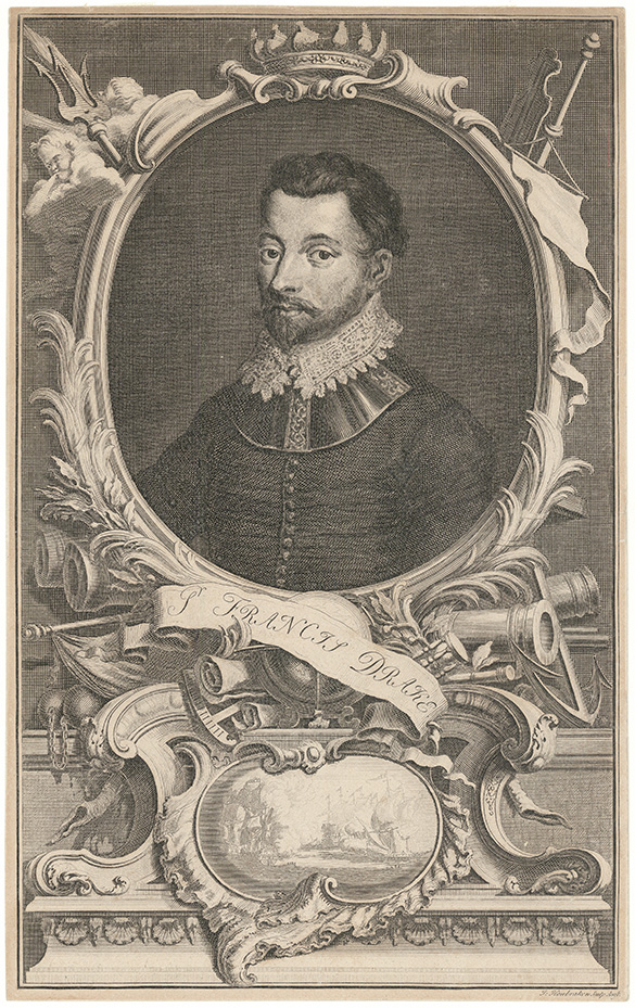 DESCRIPTION: This fine 18th-century portrait of Sir Francis Drake, engraved by the Dutch master Jacobus Houbraken, was issued as part of the celebrated Heads of Illustrious Persons of Great Britain series, published by John and Paul Knapton. Born in Devon, Drake rose to prominence through daring voyages and acts of privateering, earning both riches and infamy by raiding Spanish possessions in the New World. He became the first Englishman to circumnavigate the globe (1577–1580) aboard the Golden Hind and later played a crucial role as second-in-command in the defeat of the Spanish Armada in 1588. Though his final voyage in 1596 ended in failure, Drake remained one of the most storied figures of the Elizabethan era. Houbraken’s meticulous engraving style brings a sense of classical dignity to the image, aligning with the period’s idealization of Britain’s naval heroes.