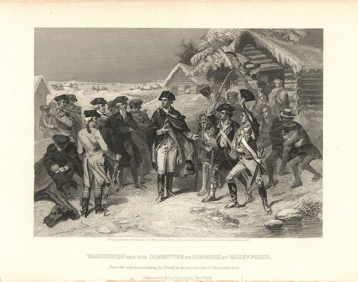DESCRIPTION: During the harsh winter of 1777–1778 at Valley Forge, General George Washington hosted a committee of Congress to address the Continental Army's dire shortages of food, clothing, and supplies. Washington presented a 16,000-word report detailing the desperate conditions and pushed for critical reforms, including officer pensions, to prevent the army's collapse.
