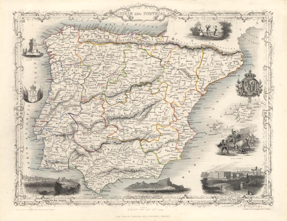 DESCRIPTION: A decorative map with vignettes, some of which are views of Lisbon, Gibralter and Madrid. This map is from "The Illustrated Atlas and Modern History of the World" Published by John Tallis, J. &. F. Tallis, or The London Printing and Publishing Company.
