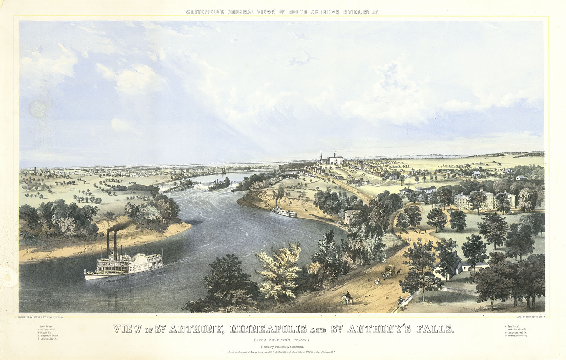 DESCRIPTION: Whitefield's Original Views of North American Cities, No. 39. Drawn from Nature by E. Whitefield. Lith of Endicott & Co. N.Y.<br><br> Key in title margin identifies 9 prominent buildings including the University of Minnesota, here labeled Minnesota University, and is shown in the lower right quarter. An important and rare view of the city.