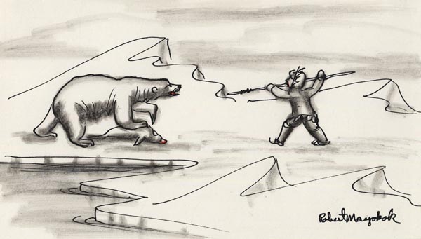 DESCRIPTION: Robert Mayokok (1903 -1983) was a native Alaskan (Inupiaq) artist, writer and adventurer. After surviving the devasting effects of the 1918 flu epidemic in his village, young Mayokok turned to hunting, trapping, and herding. He accompanied a herd of reindeer to the 1939 New York World’s Fair. In the 1950s, Mayokok took up drawing and painting after recovering from tuberculosis. A prolific artist, he would sell his depictions of Eskimo life from Anchorage galleries. Mayokok’s popularity resulted in an invitation to demonstrate his craft at the 1964 New York World’s Fair. Museums holding his work include the California Academy of Sciences, the Anchorage Museum of History and Art, the University of Alaska Museum at Fairbanks, the Ketchikan Museum, and the Kodiak Historical Society.