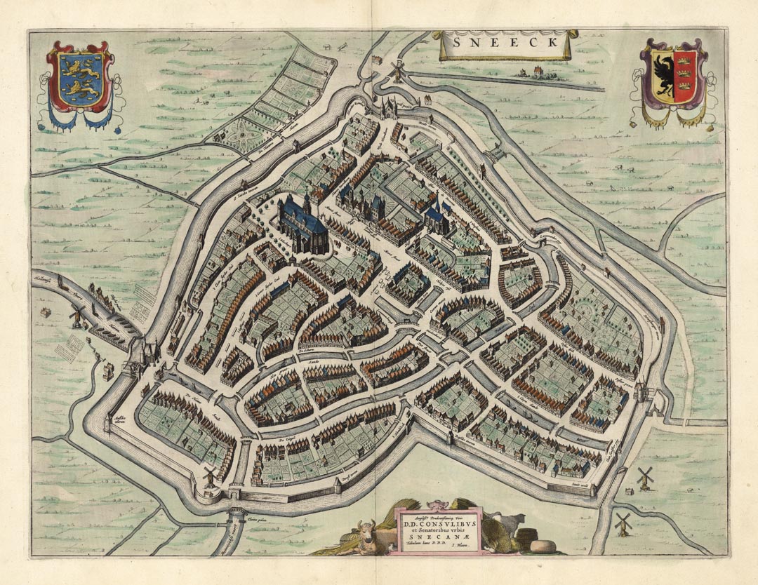 DESCRIPTION: A beautiful engraved plan of the city of Sneek in the province of Friesland. (Netherlands) This plan appeared in Blaeu's town book of the Netherlands.