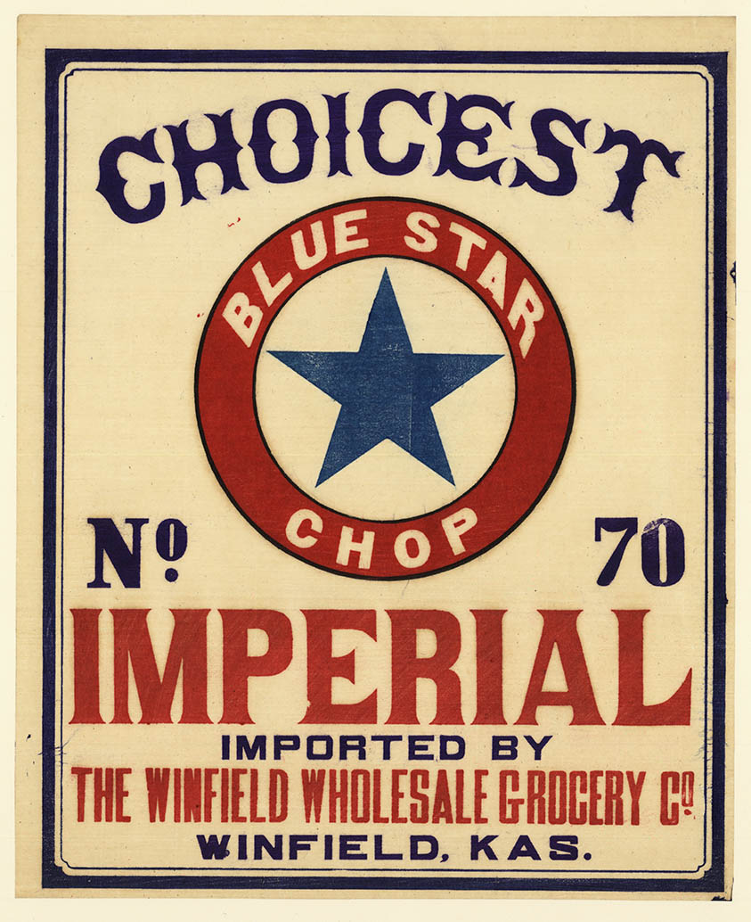 DESCRIPTION: An unusual and highly decorative advertising label for tea. This color woodcut was produced by George H. Macy & Co. for the Winfeld Wholesale Grocery Co. Winfield, Kansas. G. H. Macy & Co. was a major tea importing firm that was based in New York with offices in London, Chicago, San Francisco, and across Asia in just about every country where tea was cultivated. It had tea-processing facilities in Yokohama and Kobe, Japan, and in Shanghai, Hankow, and Amoy, China. In 1886, Carter, Macy & Co. was organized and in 1894, George H. Macy & Co. took over. It is our belief that Macy had these labels printed in Japan between 1900 and 1910 for its buyers. This label was part of a small grouping that the shop acquired. All were woodcuts and were printed on thin Japanese rice paper. Several of them had George Macy & Co. printed on them which leads us to believe that Macy was the chief publisher. Each is possibly unique as being printed on thin rice paper and an ink that is highly susceptible to water. The prints are extremely fragile which likely explains their rarity.