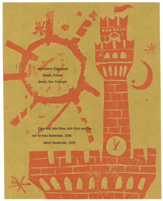 DESCRIPTION: Type set text continues "...Clare and John Ross, with Chris and Tim sail for Italy September, 1958, return September, 1959."