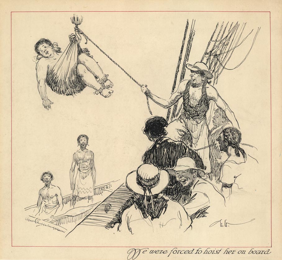 DESCRIPTION: This drawing was used to illustrate "The Life and Adventures of John Nicol, Mariner" published in 1936. As the story goes, the crew made land in Hawaii to trade and gather oil for their lamps. They were the first visitors to the Big Island since Captain Cook had been murdered several years before. The indigenous people met them with great fanfare, bringing food and other goods aboard to trade. Before long, the men, too, had chosen wives. "Almost every man on board took a native woman for a wife while the vessel remained, the men thinking it an honor, or for their gain, as they got many presents of iron, beads, or buttons. The women came on board at night, and went on shore in the morning. In the evening they would call for their husbands by name. They often brought their friends to see their husbands, who were well pleased, as they were never allowed to go away empty. <br><br> The fattest woman I ever saw in my life our gunner chose for a wife. We were forced to hoist her on board; her thighs were as thick as my waist; no hammock in the ship would hold her; many jokes were cracked upon the pair. "<br><br>