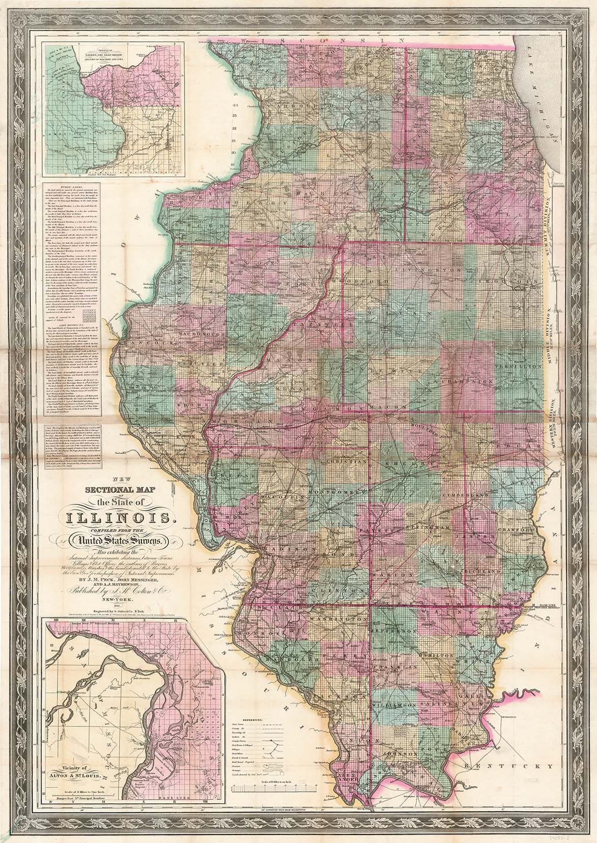 DESCRIPTION: The title continues with "Also exhibiting the Internal Improvements, distances between Towns, Villages, & Post Offices: the outlines of Prairies, Woodlands, Marshes & the lands donated to the State by the Genl. Govt. for the purpose of Internal Improvement." By J. M. Peck, John Messinger and A. J. Mathewson. Two insets: Vicinity of St. Louis and Vicinity of Galena, the Lead region and part of Wisconsin and Iowa. Additional inset texts describe Public Lands, Land Districts, and the Illinois and Michigan Canal. Engraved by S. Stiles & Co. N.York. Drawn on a scale of ten miles to an inch.<br><br> This important map of Illinois was first published in 1835, and republished in various states until 1869. It was one of the best and most detailed maps of Illinois during its time. It separates the region into differently colored counties, and includes towns of various sizes, topographical detail and commentary, travel routes such as ferries and railroads, mines, and private settlements.<br><br>