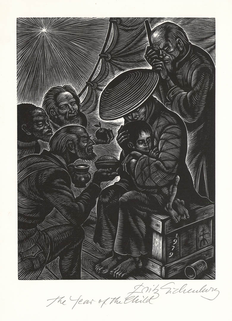 DESCRIPTION: Signed and titled in pencil. <br><br> This is an artist made Christmas card, sent by Eichenberg to friends. The wood engraving is on the front and a personalized message is written inside. Inscribed inside, "To Clare, John, Tim, Christopher with affection from the Eichenbergs. 1980 AD."