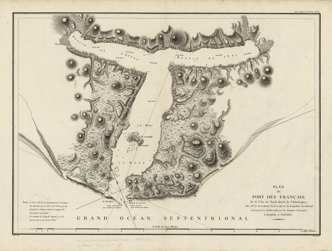 DESCRIPTION: Large chart of Lituya Bay, located within Glacier Bay National Park, along Alaska's southeastern coast. La Perouse discovered the bay in 1786 and named it Port des Francais. From the French edition of Vancouver’s Voyage of Discovery. Engraved by Herault.