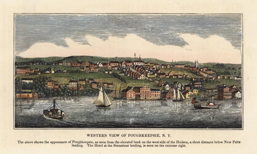 DESCRIPTION: Text under title line: "The above shows the appearance of Poughkeepsie, as seen from the elevated bank on the west side of the Hudson, a short distance below New Paltz landing. The Hotel at the Steamboat landing, is seen on the extreme right." From "Historical Collections of the State of New York" by Henry Howe and John W. Barber.