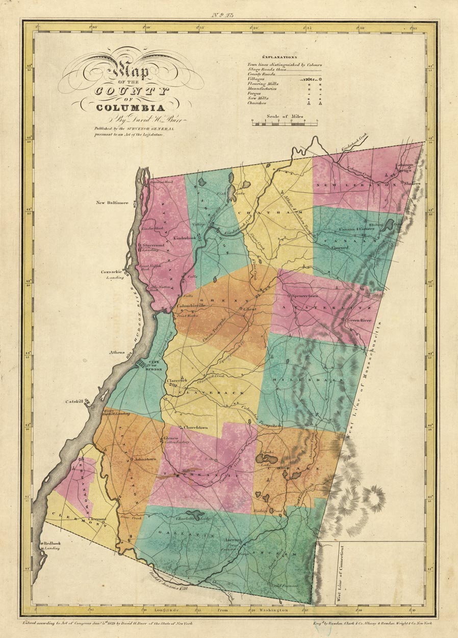 DESCRIPTION: A fine map from Burr's "An Atlas of the State of New York Containing a Map of the State and of the Several Counties. Projected and Drawn by a Uniform Scale... under the Supervision & direction of Simon De Witt, Surveyor General.…" "It is a magnificent publication and was the second atlas of an individual state ever published." (Ristow). Engraved by Rawdon Clark & Co. Albany & Rawdon, Wright & Co. N.Y. Each township is seperately colored. Towns, villages and early roads noted.