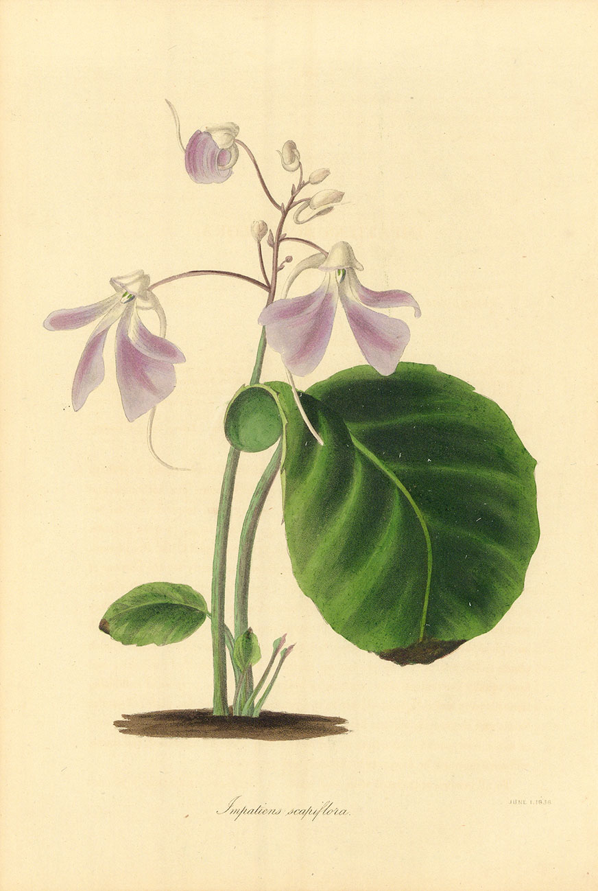 DESCRIPTION: This hand-colored lithograph of the Leafless-Stem Balsam (Impatiens scapiflora) was drawn and rendered on stone by S. Holden. First published in "Paxton's Magazine of Botany," the artwork highlights the delicate beauty of the Leafless-Stem Balsam with the meticulous detail typical of botanical illustrations from this period. Native to Southeast Asia, Impatiens scapiflora is known for its striking, tubular flowers that range in color from deep pink to purple, with a unique, elongated spur. Thriving in moist, well-drained soils and shaded environments, it typically blooms in late summer to early fall. As a member of the Balsaminaceae family, Impatiens scapiflora is a popular choice for ornamental gardens due to its vibrant flowers and distinctive, leafless stems.