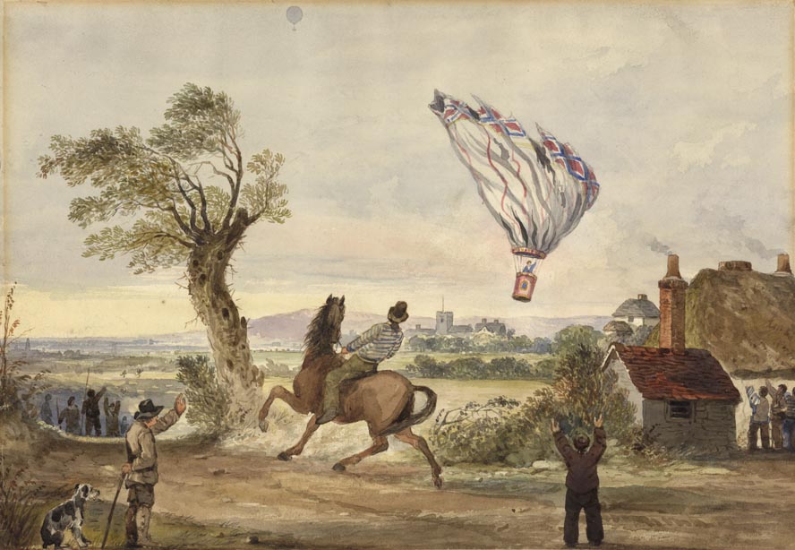 DESCRIPTION: The Nassau Balloon, which had hoisted Mr. Cocking into the air, can be seen in the distance, near the upper paper edge. Mr. Cocking was an amateur scientist bent of improving Andre-Jacques Garnerin’s 1802 parachute design. His concept was a complete failure and Mr. Cocking plummeted to his death shortly after his release from the Nassau. His failed decent made him infamous.
