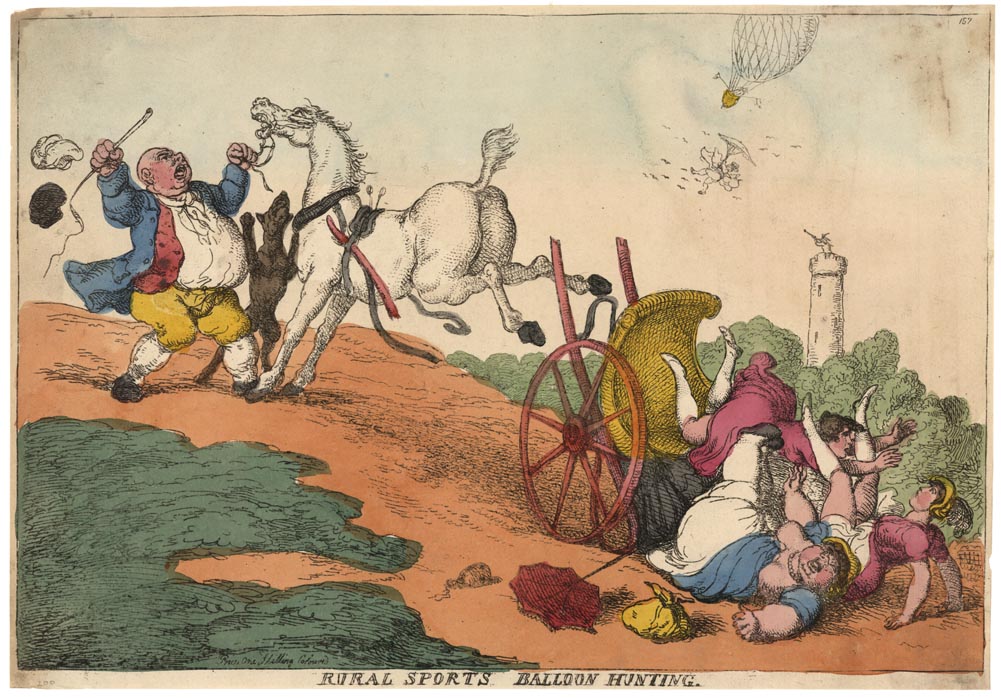 DESCRIPTION: This is a satirical printing showing a group running into trouble while out searching for hot air balloons. Their horse has broken free of their small wagon, sending it's three occupants hurtling the ground as a gentleman tries to tame the crazed horse. In the distance a hot air balloon and a woman being blown away with her umbrella can be seen.