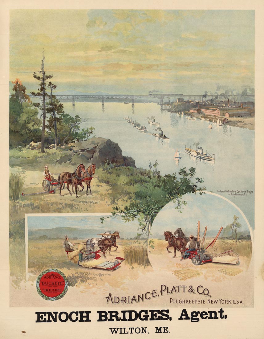 DESCRIPTION: A fine advertising broadside for the farm equipment manufacturer Adriance, Platt & Co. The main scene shows Poughkeepsie, NY from across the Hudson with the newly completed railroad bridge. John P. Adriance (1825-1891) received his first patent for farm machines in 1852. He went into the wholesale hardware trade with his brother-in-law, Samuel R. Platt, and Samuel W. Sears under the name of Sears, Adriance & Platt. In 1854, that concern purchased the Manny mower patent for the New England states and began building the machine in Worcester, Massachusetts, in 1857 under the name of John P. Adriance. Adriance acquired patent rights for the same territory for his mower. Honoring its roots in Ohio, he named the machine the Buckeye. He abandoned the Manny machine and moved the factory to Poughkeepsie in 1859. In 1863, Sears, Adriance & Platt was succeeded by Adriance, Platt & Co. In 1882, the business was incorporated and Adriance was elected president, a position he held until his death in 1891. Adriance, Platt & Co. limited itself to manufacture of horse-drawn farm machinery until 1913, when the company was sold to Moline Plow Co., Moline, Illinois.