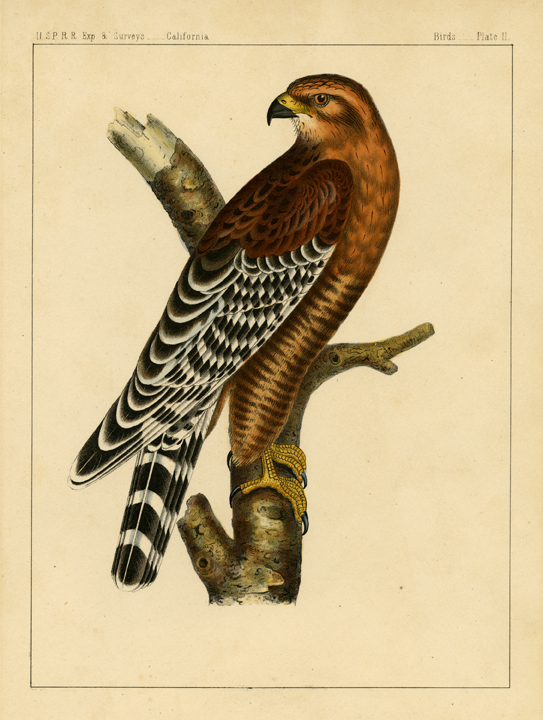DESCRIPTION: U.S.P.R.R. Exp. & Surveys. California. <br><br> A mid-19th-century lithograph depicting the Red-bellied Hawk, capturing its robust form, distinctive coloring, and alert posture. Produced by the prominent New York lithography firm Sarony, Major & Knapp, this print exemplifies the careful observation and detailed rendering typical of Victorian natural history illustrations.