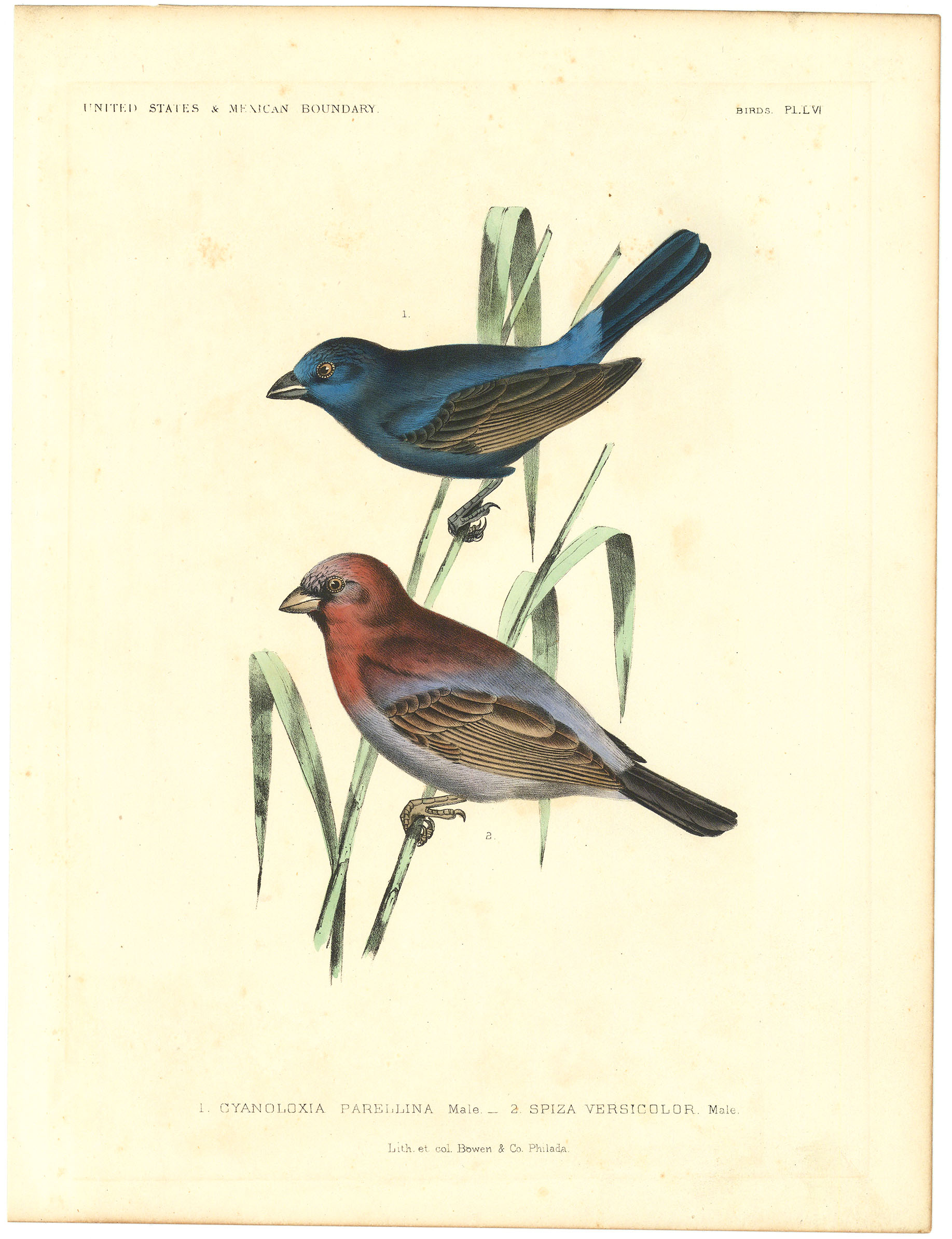 DESCRIPTION: This lithograph from the United States and Mexican Boundary Survey Report by William H. Emory, produced by Bowen & Co. of Philadelphia, beautifully captures the Blue Bunting and Painted Bunting with vivid colors and fine detail. The print combines scientific accuracy with artistic elegance, highlighting the importance of early natural history documentation.