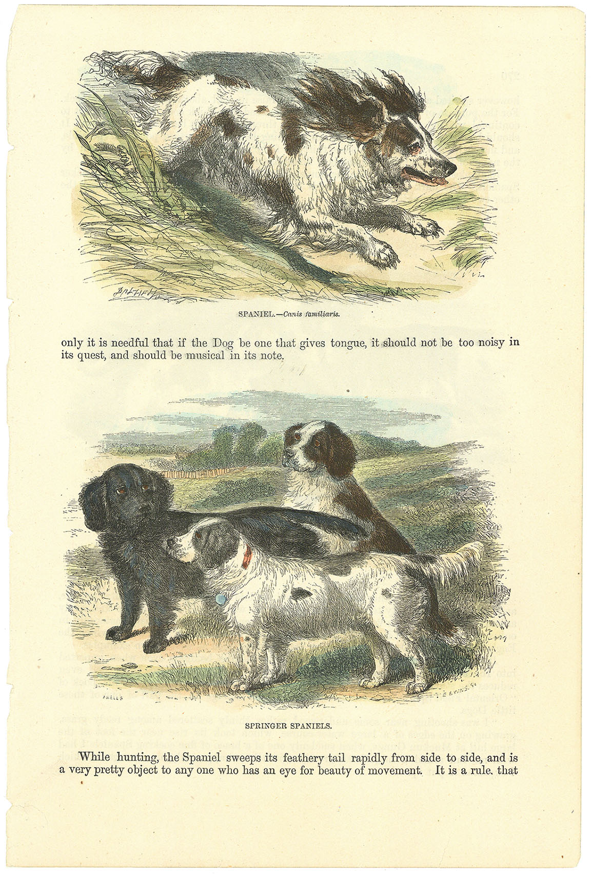 DESCRIPTION: Two illustrations of spaniels on a page with informative text.