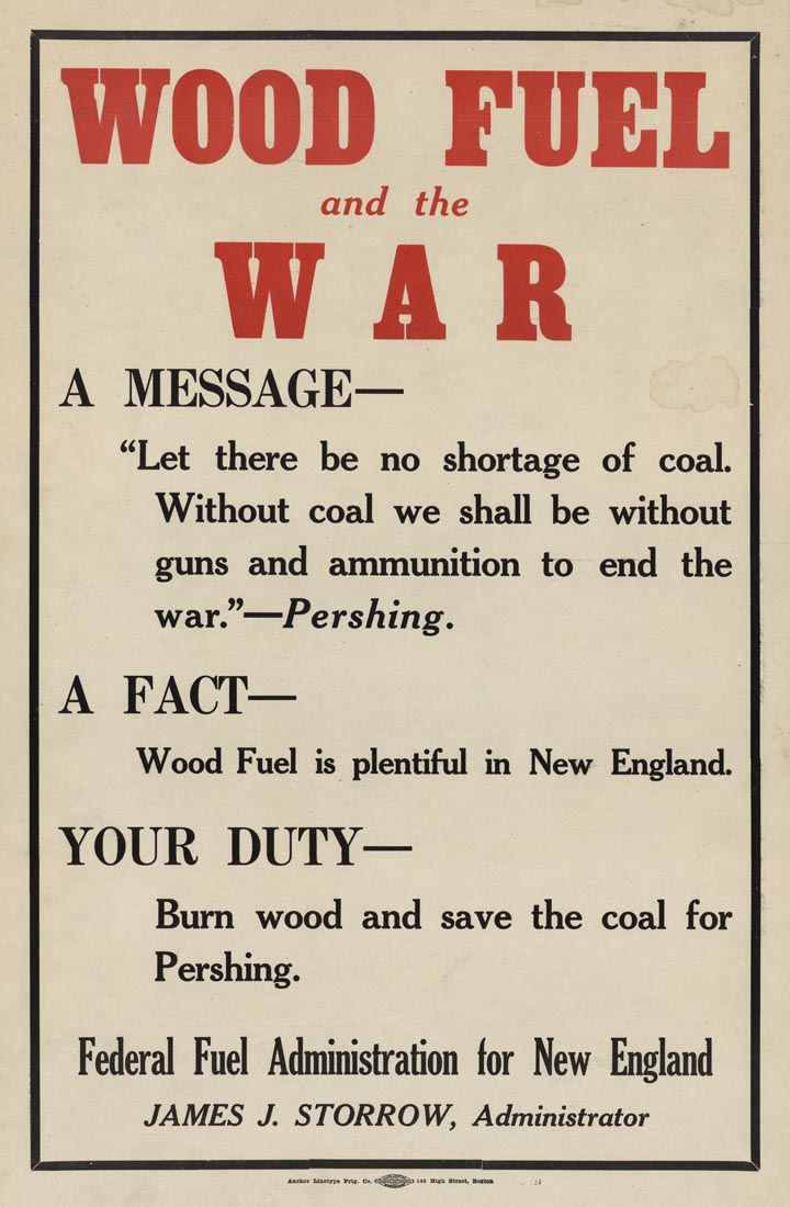 DESCRIPTION: Anchor Linotype prtg. Co. 144 High Street, Boston. A World War 1 poster trying to convince people to use wood to heat their homes instead of coal, so there would be enough coal to fuel the war machine.