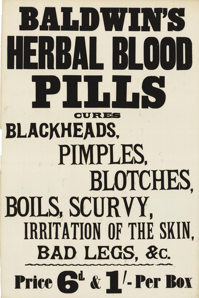 DESCRIPTION: Advertising poster published in England, c. 1880. A typical patent medicine for the gullible public: It claims to cure an assortment of ailments. Black and white.