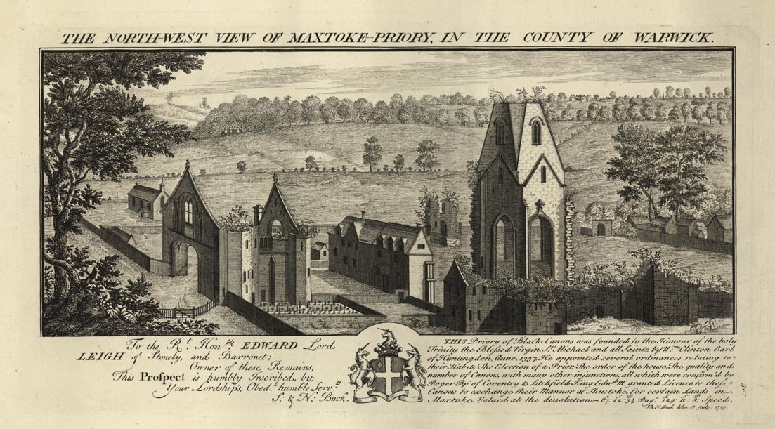 DESCRIPTION: Text below image reads, "This priory of Black Canons was founded to the honour of the holy Trinity, the Blessed Virgin, St. Michael and all saints, by Wm. Clinton Earl of Huntingdon, Anno 1337."