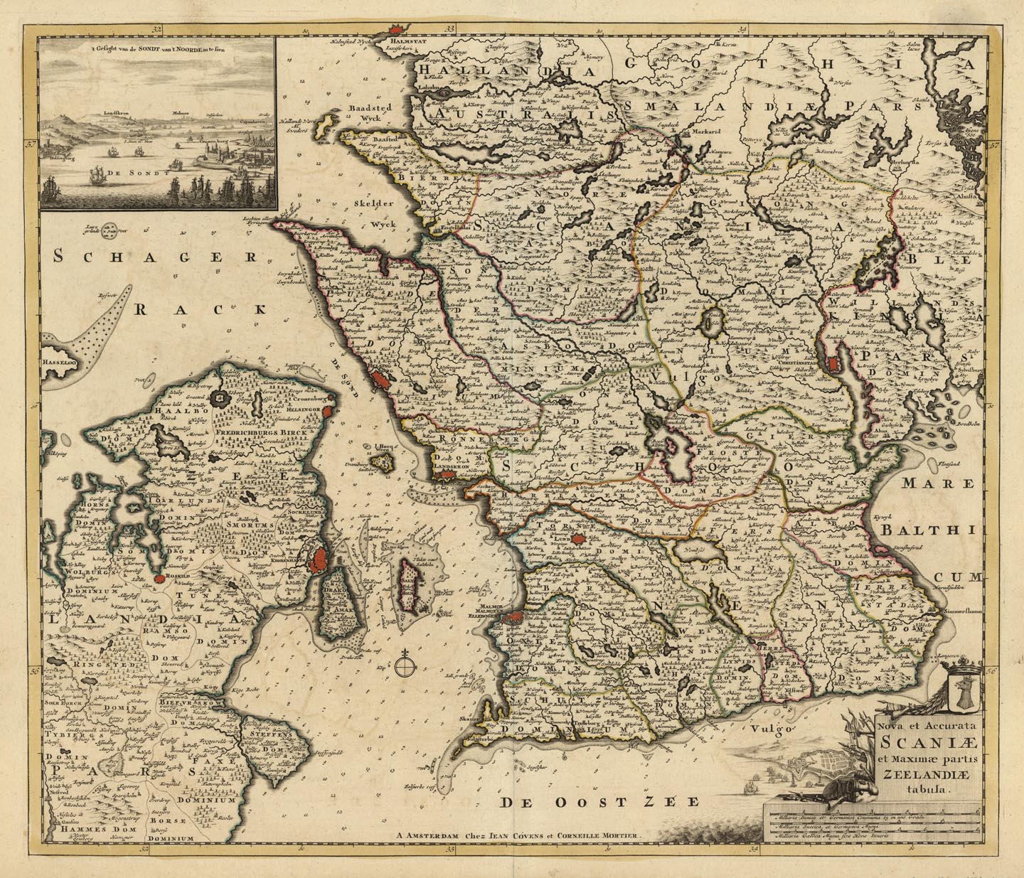 DESCRIPTION: A very scarce regional map focused on the sound between Denmark and Norway. Shows an area from Halmstat in the north, Sylvisborg and Christianstad in the east and part of Hasseloo in the west. Includes Capital region of Denmark. In the upper left is a view titled "t Geright van de Sondt van't Noorde in te sien."