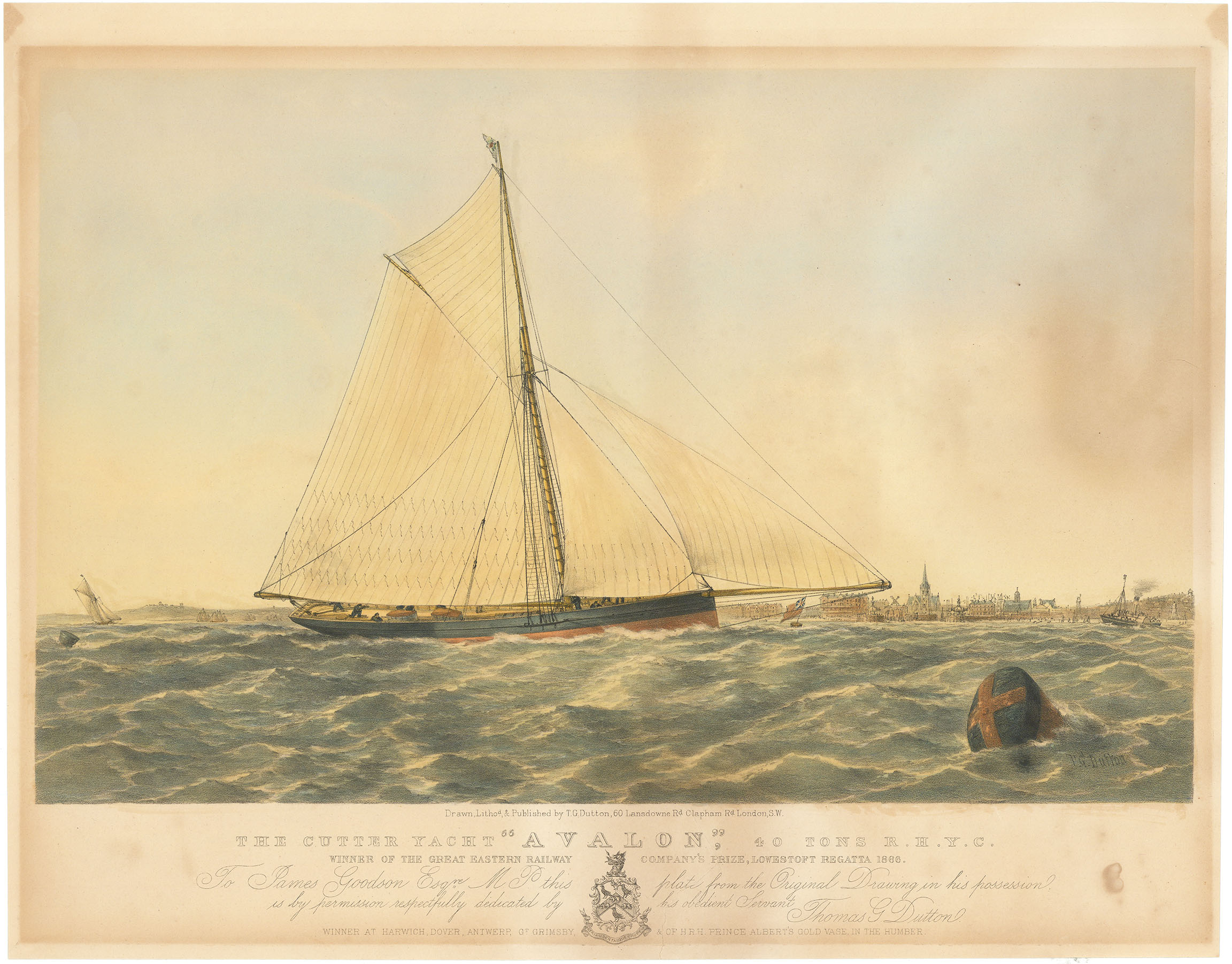 DESCRIPTION: This lithograph, produced around 1866 by marine artist Thomas Goldsworthy Dutton, depicts the cutter yacht Avalon, a 40-ton vessel registered with the Royal Harwich Yacht Club. The image commemorates her victory at the Lowestoft Regatta, where she earned the Great Eastern Railway Company’s prize that year. Dutton, recognized for his precision and craftsmanship, portrays the yacht under full sail, cutting cleanly through the water. Executed as a two-stone lithograph with hand coloring, the work captures both the competitive spirit of the regatta and the refined grace of mid-19th-century yachting.