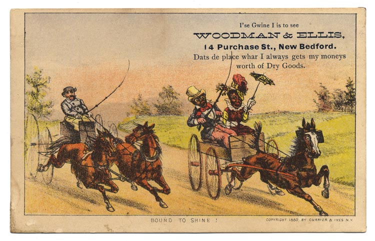DESCRIPTION: Advertisement for the Woodman & Ellis, 14 Purchase St., New Bedford. printed on the front.