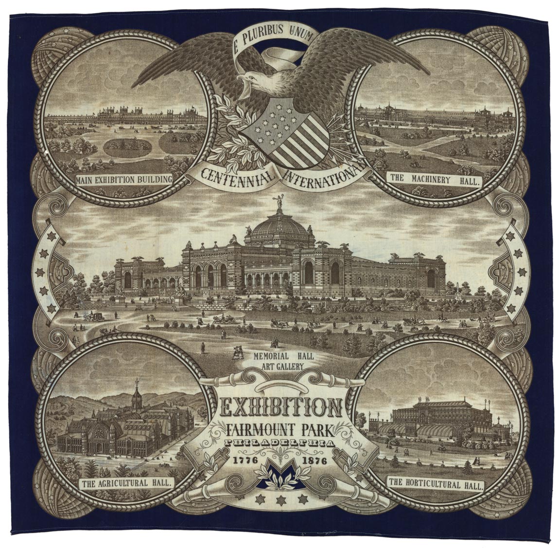 DESCRIPTION: Chestnut brown and royal blue printed cotton bandanna. Top and bottom are hemmed with side selvages (woven finish). "E Pluribus Unum" flies over the eagles head. The five exhibition buildings shown are: Main Exhibition Building; The Machinery Hall; Agricultural Hall; and Horticultural Hall.