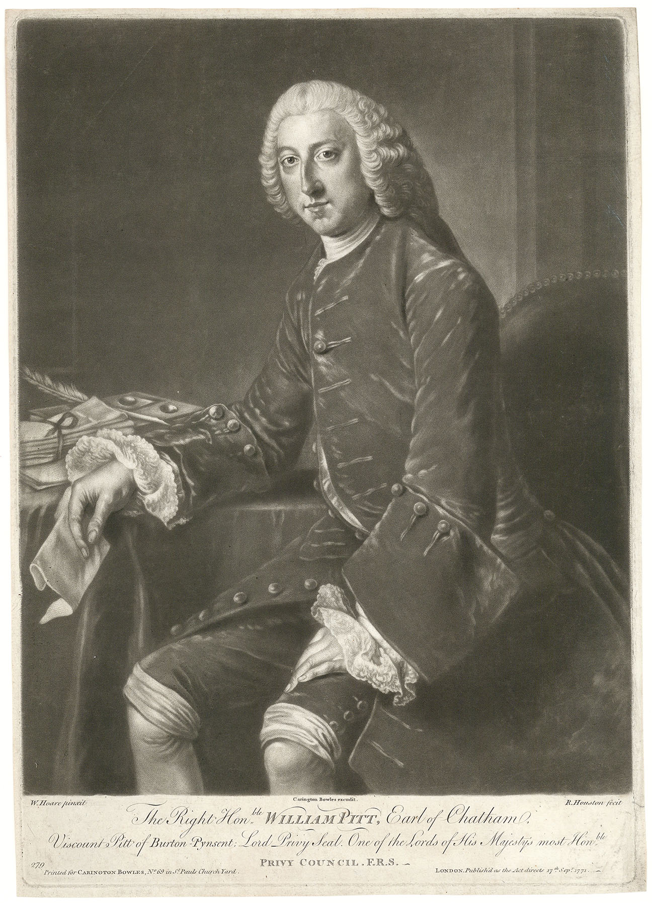 DESCRIPTION: A finely executed portrait of William Pitt, shown seated at a table scattered with books, letters, and a quill, his hand holding a sheet of paper as if caught in thought. Although created before his time as Prime Minister, Pitt would later emerge as one of Britain’s most influential leaders during and after the American Revolutionary War. His financial and administrative reforms helped stabilize Britain’s economy and reestablish confidence in its government following the loss of the American colonies.