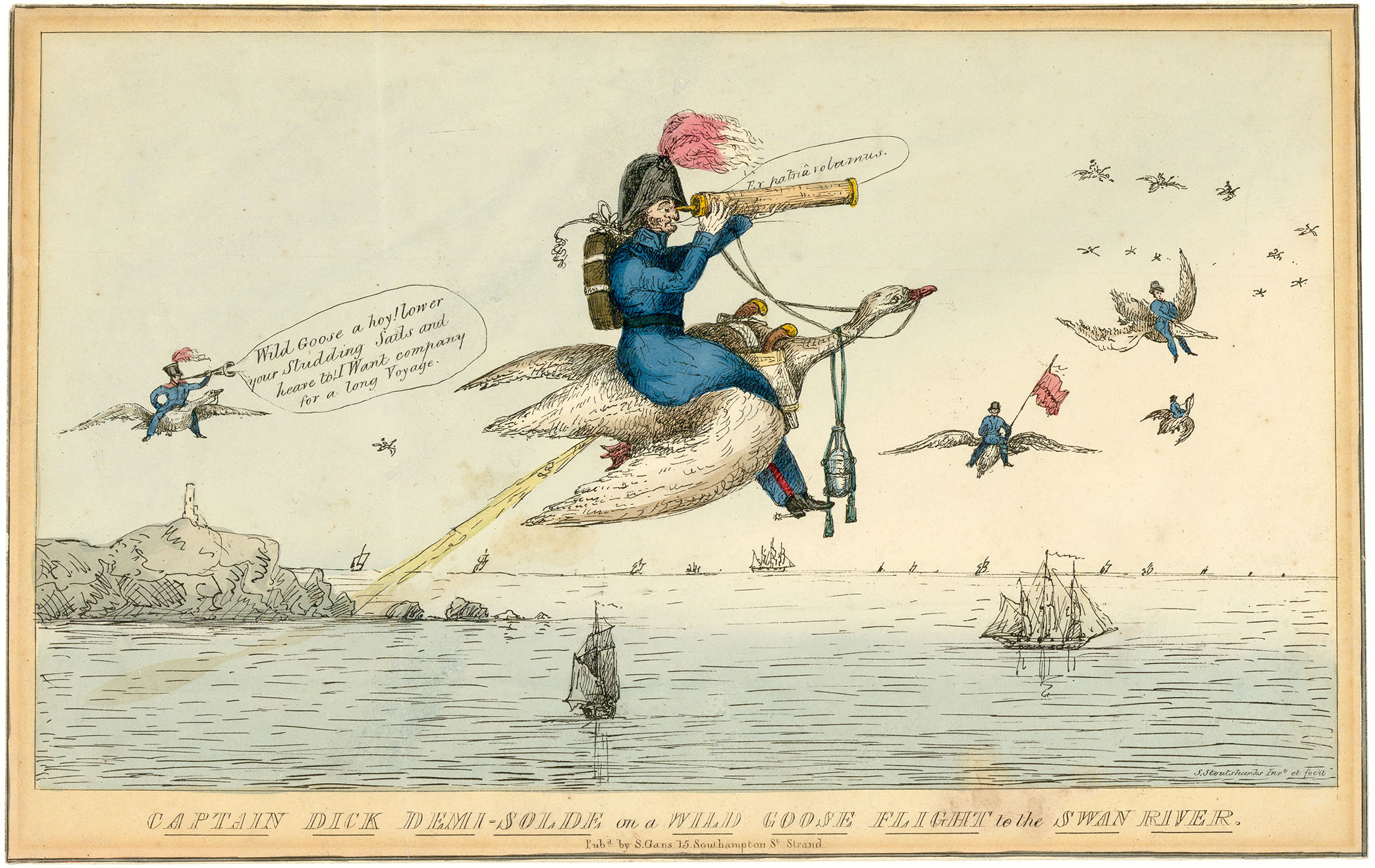 DESCRIPTION: J. Stoutshanks invt. et facit. This satirical illustration depicts the Swan River Colony in Western Australia. Several men ride upon the backs of swans which, while shown as being white, are actually black in Australia. The artist might have chosen to make this alteration because European were accustomed to white swans, not black ones at the time. In the image, on the left, a man calls, "Wild Goose ahoy! Lower your Studding Sails and have to! I want company for a long voyage." The can in the center says, " Ex patria volatimus."