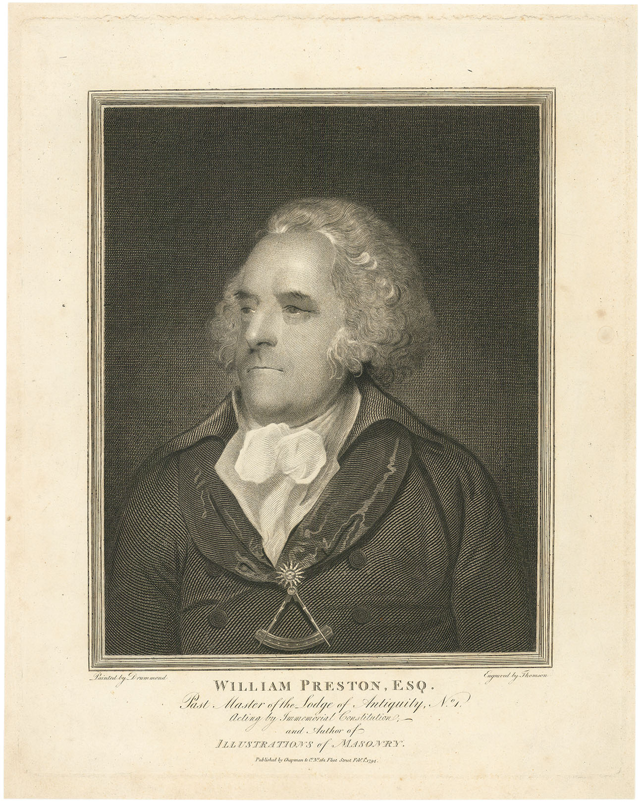 DESCRIPTION: This engraving, after a painting by Drummond and engraved by Thomson, depicts William Preston, the influential Scottish author, editor, and Freemason. Educated in Edinburgh, Preston began his career assisting the classical scholar Thomas Ruddiman before moving to London to work under printer William Strahan. Though well-connected in literary circles, Preston is best remembered for his contributions to Freemasonry. Initiated in 1763 into the Lodge of London, he later became Worshipful Master of the Lodge of Antiquity No.1 in 1774. His landmark 1772 work Illustrations of Masonry became a foundational Masonic text, widely published in England, America, and Europe.