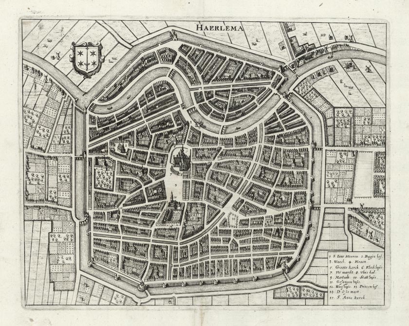 DESCRIPTION: A fine map of Harlem. A numbered identifuies 15 locations important buildings and locations. From Matthew Merian's "Topographia," published in Frankfort.