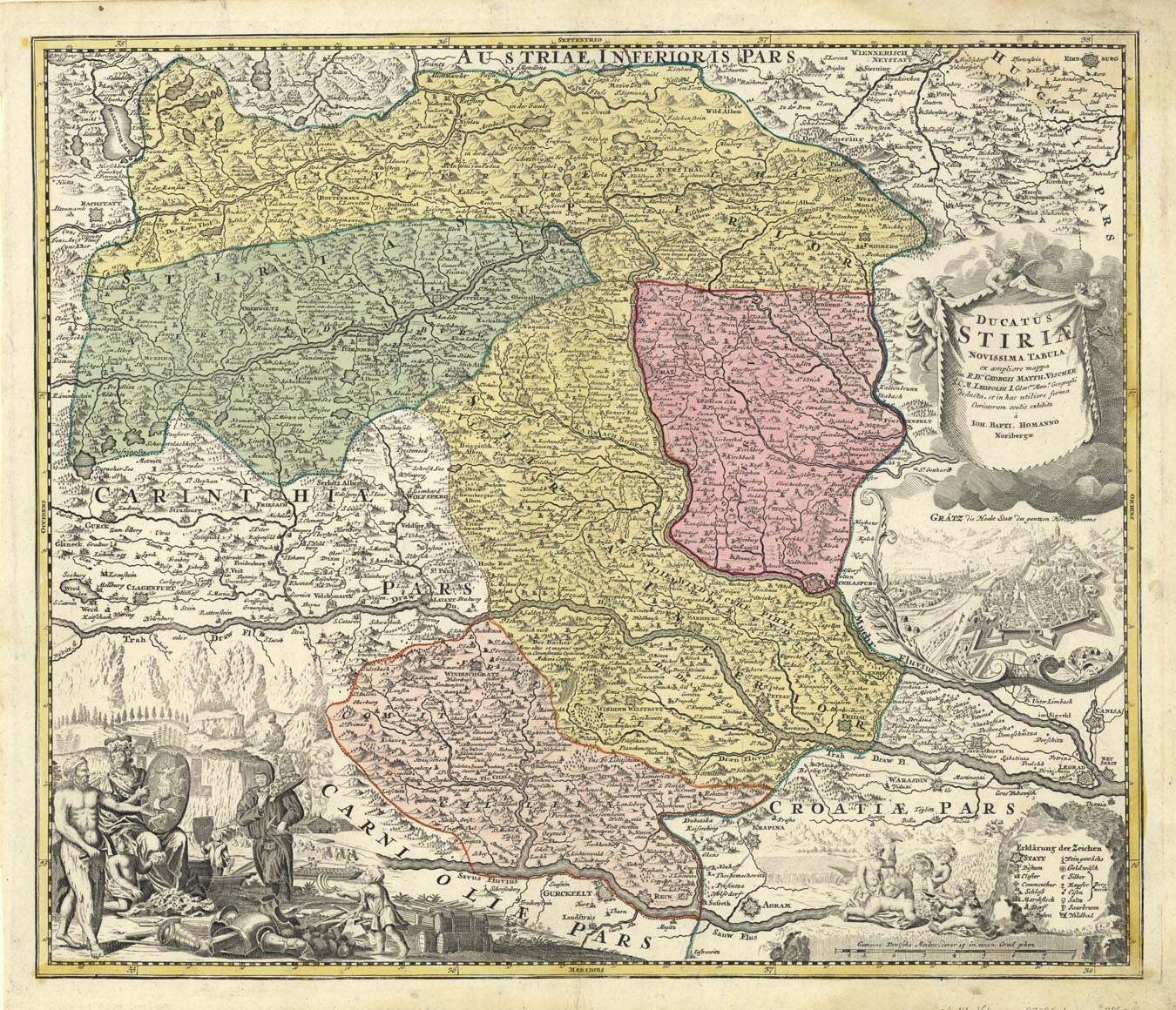 DESCRIPTION: A fine map of Steiermark, Austria, Embellished by three eloborate cartouches and vignettes and a view of Gratz. Johann Baptist Homann was a German engraver and publisher who established himself and his family in Nuremberg in 1702. He published his first atlas, "Atlas Novus" in 1707, and in recognition of this achievement, he was elected to the Berlin Academy of Sciences. In 1715 Homann was appointed Geographer to the Emperor. Homann died in 1724 and his business was continued by his family under the name Homann's Heirs into the late 18th century.