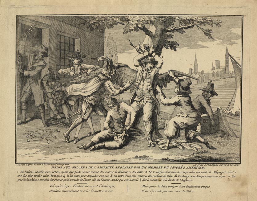 DESCRIPTION: A scarce American Revolutionary satirical print.<br><br> Translated title: Dedicated to the Lords of the British Admiralty by a Member of the American Congress.<br><br> This satire comments on European aid to the colonist as the Revolutionary struggle continued. Explanations of the numbered figures appear below with a brief humorous verse. England, symbolically pictured as half-man, half-vulture, is tied to a tree. a figure representing a native American, trims its claws, a Spaniard holds one wing so that a Frenchman clips it, and a Dutchman plucks feathers, representing trade, from the other wing, while a companion packs them and carries them away. To the far left another Frenchman is holding rolls of tobacco, while a despairing Englishman standing in the doorway is breaking pipes for which he no longer has a use. -Dolmetsch.<br><br> Although the print suggests that it was engraved and printed in America “Dessine d'apres nature, a Boston par Corbuten en 1778 et Grave a Philadelphi par Va de Bon Coeur”, it is far more likely that it was produced in France.<br><br> Little is known of Corbett the artist. It has been assumed that the maker was Charles Corbett, a pseudonym for Richard Purcell, a Dublin artist, and engraver known to have been working in London and engraved revolutionary war-related material.