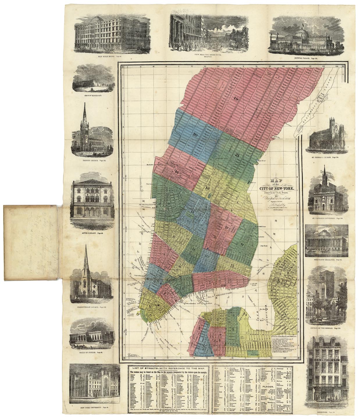 DESCRIPTION: A scarce and unusual guide map to New York. The map gives to credit to David Burr whose map of the city in 1833 which shows the city up to 37th Street on the east side. This map has been extended up to the extreme eastern end of 77th Street. Surrounding this map are important public buildings, churches and even the publishers, "C. S. Francis and Co." bookstore. Another illustration shows the short lived New York Crystal Palace. This iron and glass structure was built in 1853 and burned in 1858. It was located at today’s Bryant Park, directly behind the New York Public Library. Other buildings shown include the Merchants' Exchange, Astor House, New York University and Halls of Justice, aka, the tombs. Below the map is a list of streets with reference to the map.