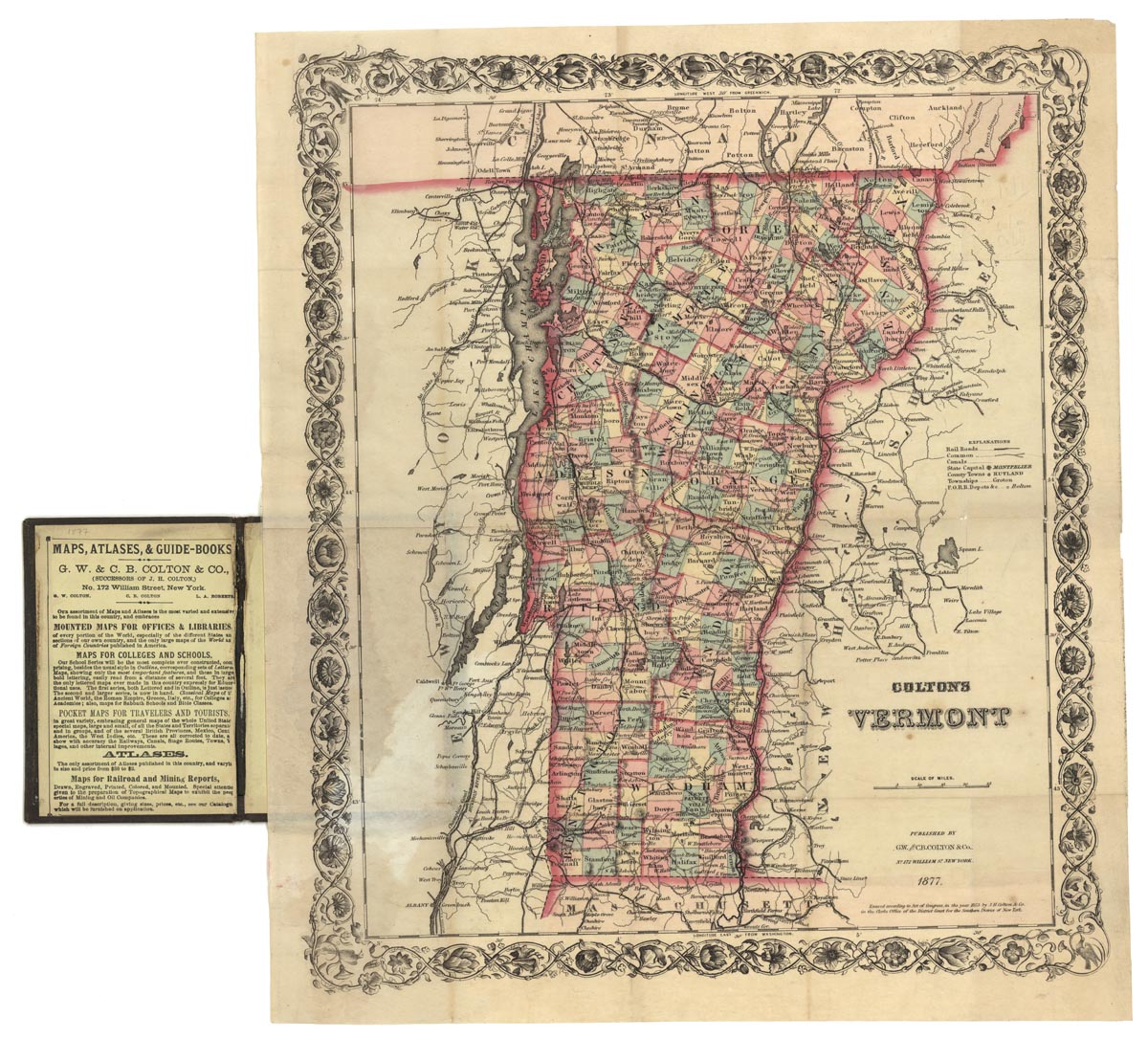DESCRIPTION: A separately issued pocket map of the Green Mountain State. The map identifies counties, townships, towns, villages, roads, railroads, and topographical features. Colored by townshop with counties outlined.