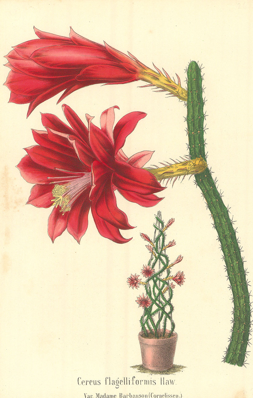 DESCRIPTION: This chromolithograph of a Rattail Cactus (Cereus flagelliformis Haw) is from "Flora des Serres et des Jardins de l'Europe" and finished by hand by Louis Van Houtte, a lavish Belgian periodical issued from 1845 to 1880.
