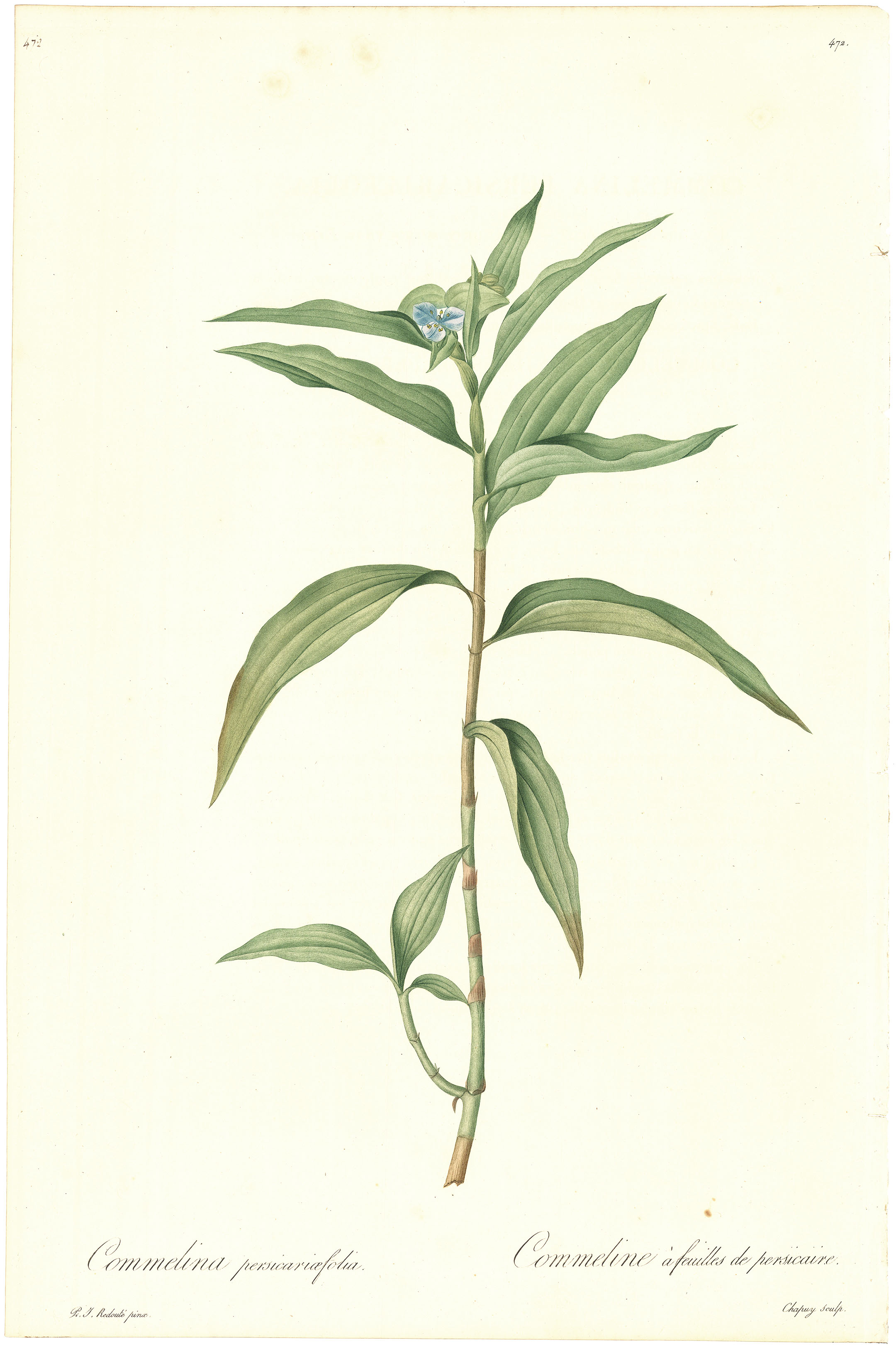 DESCRIPTION: This wonderful botanical plate originates from Pierre-Joseph Redoute’s masterpiece, Les Liliacees, published in Paris between 1802 and 1816. Widely considered one of the finest achievements in botanical illustration, the work certainly reigns amongst botanical engravings, featuring the Persicaria-leaved Dayflower (Commelina persicariaefolia) captured with a level of realism previously unseen in the medium. The brilliance of the plate lies in Redoute’s mastery of stipple engraving, a specialized technique he refined to move beyond the limitations of traditional line engraving. By utilizing thousands of tiny dots of varying sizes and densities rather than solid lines, Redoute was able to create the soft, ethereal gradients and delicate tonal shifts necessary to depict the unique, spade-shaped leaves and the distinctive structure of this dayflower. The technical execution of these plates, engraved by Chapuy, involved a sophisticated process of color printing known as "a la poupee," where various inks were applied directly to a single copper plate using a small rag wad (a poupee). This allowed for multiple colors to be printed in a single pass, ensuring a seamless, naturalistic blend between the lush, elongated foliage and the subtle textures of the plant's stems. To achieve ultimate scientific precision, each plate was meticulously finished by hand with watercolor, adding fine botanical details that the printing process alone could not capture. Published in Paris between 1802 and 1816 in a limited edition of 200, this work remains a pinnacle of early 19th-century printmaking.