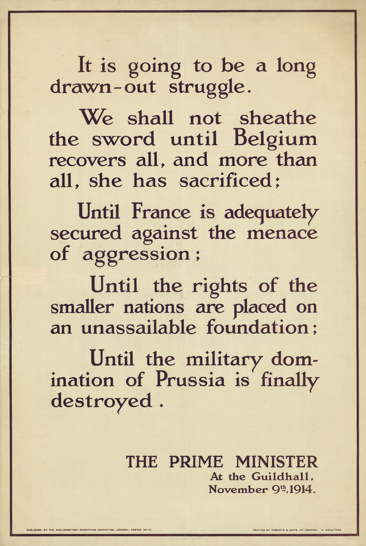 DESCRIPTION: A British World War I poster, printed by Roberts & Leete Ltd. London. The quote is from a speech made by the Prime Minister at the Guildhall on November 9th, 1914.