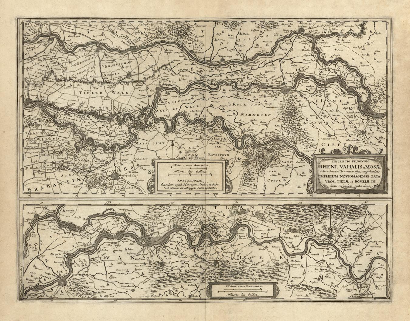 DESCRIPTION: The upper map is of the Netherlands, along the Rhine, hosting cities such as Wageninge (Wageningen), Rheenen (Rhenen) and 's-Hertogenbosch. The bottom map is a continuation, starting around Nimmegen (Nijmegen) and Arnhem, and passes over the German border to show Emmerich (Emmerich am Rhein) and Wessel.