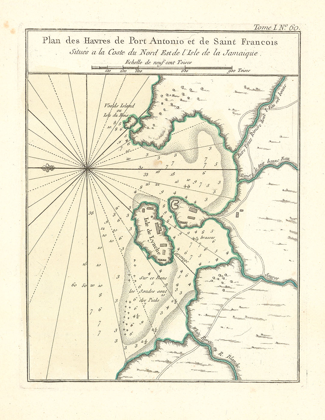 DESCRIPTION: A fine early map of Jamaica, focused on the area around Port Antonio. This map is from Bellin's "Le Petit Atlas Maritime, ou Recueil de Cartes et de Plans des Quatre Parties du Monde". This atlas or pilot is a wonderful French produced small sized work that depicted a great many parts of the known world.