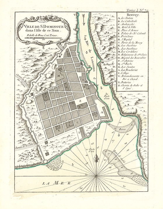 DESCRIPTION: A fine early map of Santo Domingo, Dominican Republic. The Lauzama river, now called the Rio Ozama, can be seen on the right. This map is from Bellin's "Le Petit Atlas Maritime, ou Recueil de Cartes et de Plans des Quatre Parties du Monde". This atlas or pilot is a wonderful French produced small sized work that depicted a great many parts of the known world.