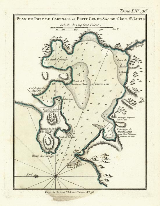 DESCRIPTION: This map titled "Plan du Port du Carenage ou Petit Cul de Sac de l'Isle St. Lucia" was crafted by Jacques Nicolas Bellin in 1764 for his "Le Petit Atlas Maritime, ou Recueil de Cartes et de Plans des Quatre Parties du Monde." This detailed map offers a comprehensive view of the harbor area known today as Castries, St. Lucia, highlighting its natural harbor and strategic importance during the 18th century. Bellin’s depiction includes intricate details of the coastline, depth soundings, anchorage points, and navigational hazards, making it an essential tool for maritime navigation at the time. <br><br> As the Official Hydrographer to the French King, Bellin brought expert precision to his work, ensuring that each map served not only as a piece of art but also as a practical guide for sailors and explorers. This map is particularly valuable for its historical context, illustrating the geographical knowledge and cartographic skills of the period, and it remains a prized collectible for its aesthetic appeal and historical significance.