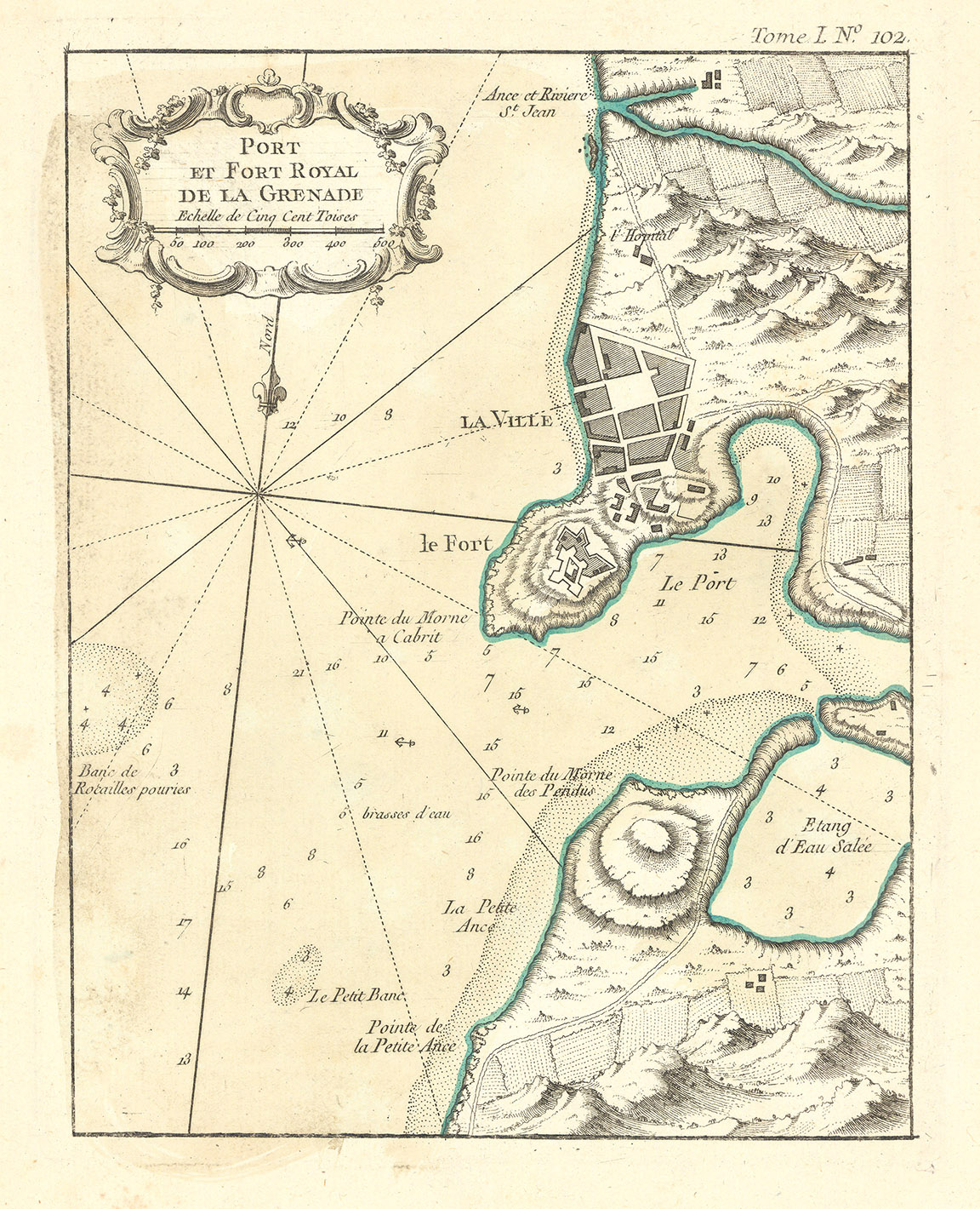 DESCRIPTION: This map, "Port et Fort Royal de la Grenade" by Jacques-Nicolas Bellin, 1764, is an early and detailed map of the area now known as St. George’s, the capital of Grenada. Published in Le Petit Atlas Maritime, Bellin’s renowned nautical atlas, this map captures the harbor and fortifications at a time when Grenada was a contested colonial prize. Just a year before its publication, the island was ceded from France to Britain under the Treaty of Paris in 1763, marking a pivotal shift in control of this valuable Caribbean territory. <br><br> Bellin’s map highlights the natural harbor, strategic fort, and surrounding terrain with remarkable clarity. Its fine engraving and careful labeling reflect the mapmaker’s commitment to accuracy, serving both military and navigational purposes. A valuable piece for collectors of colonial-era maps, this print offers a compelling glimpse into the geopolitical landscape of the 18th-century Caribbean.